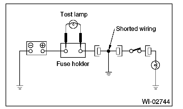Connect a test light (rated at approx. 3 watts) in place of the blown fuse and allow current to flow through the circuit. Disconnect one connector at a time from the circuit. Starting with the one located farthest from the power supply. If the test light goes out when a connector is disconnected, the wiring between that connector and the next connector (farther from the power supply) is shorted.