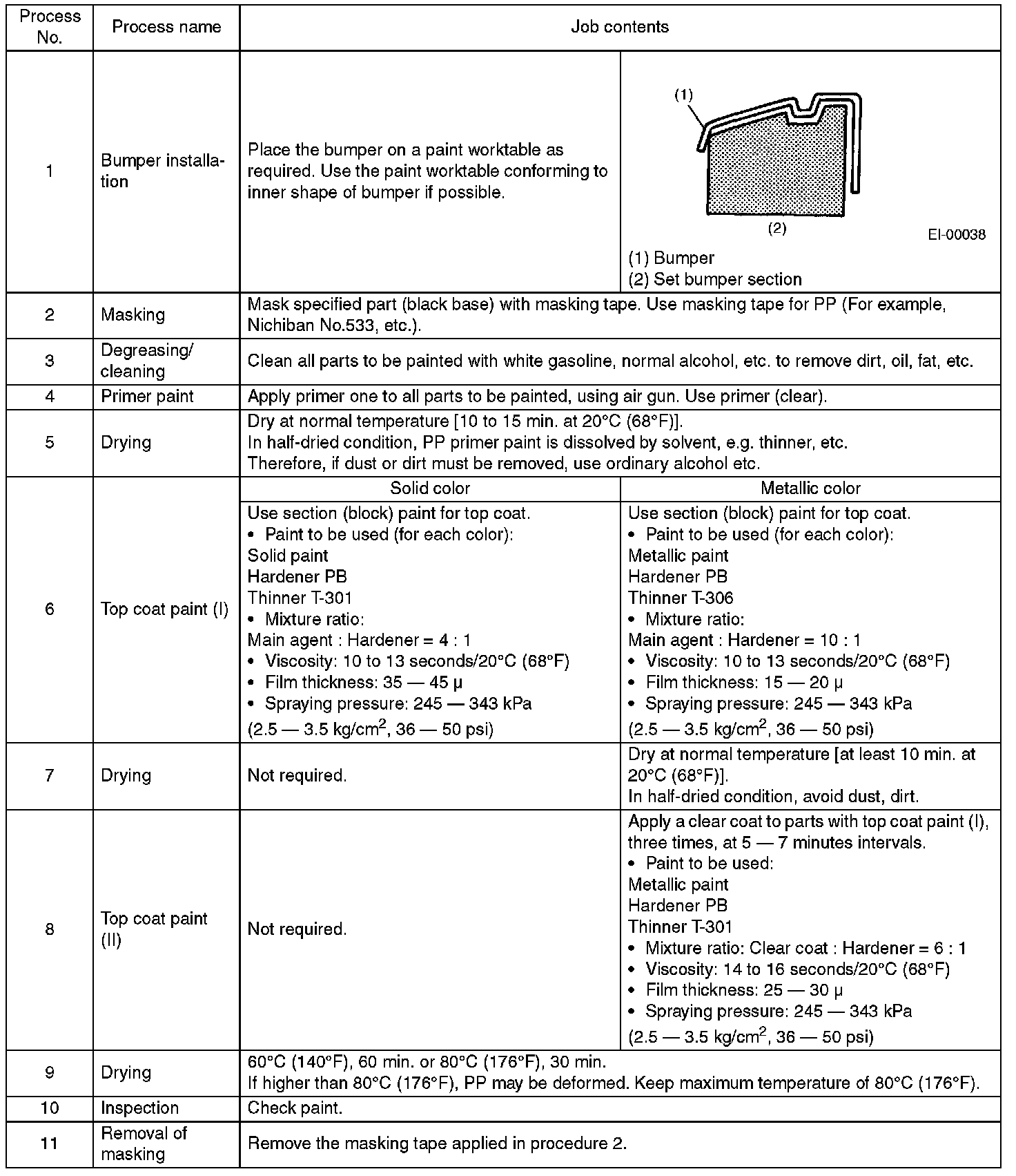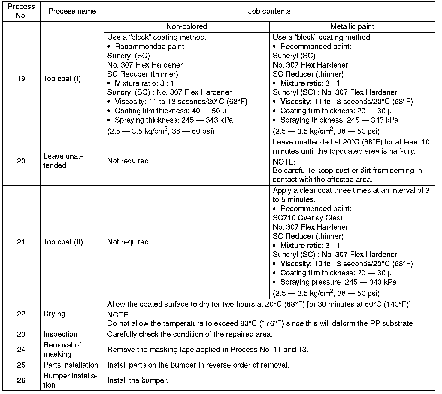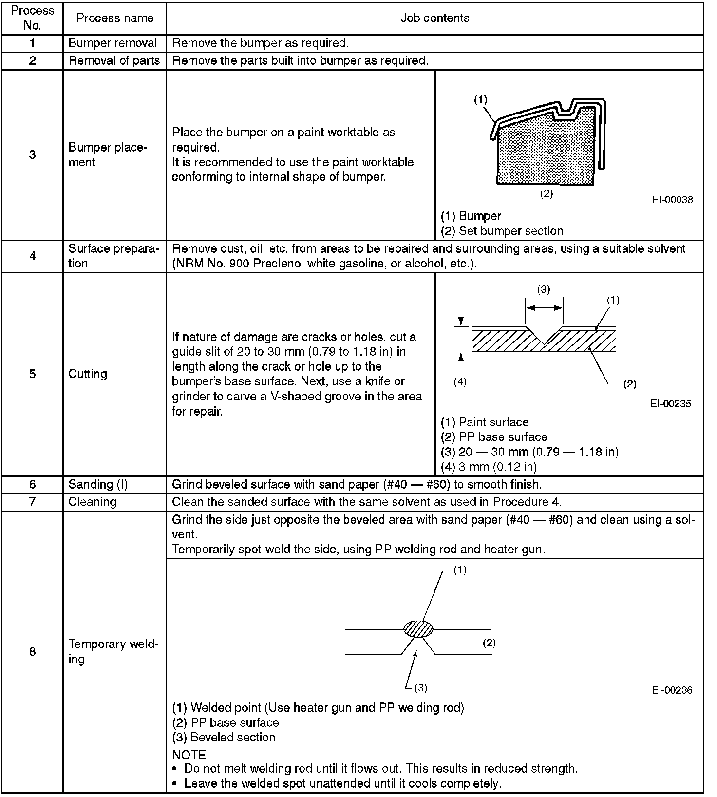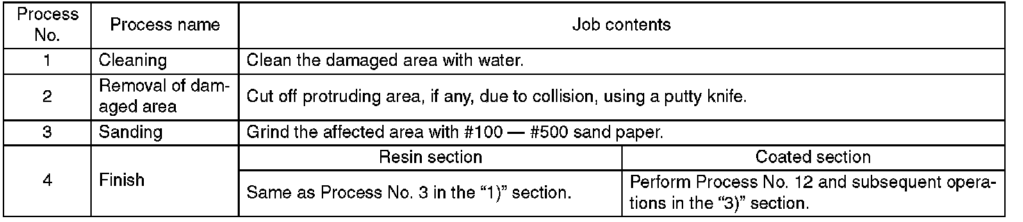 NOTE: All PP bumpers are provided with a grained surface, and if the surface is damaged, it cannot normally be restored to its former condition. Damages limited to the shallow scratches that cause only a change in the luster of the base material or coating, can be almost fully restored. Before repairing a damaged area, explain this point to the customer and obtain an understanding about the matter. Repair methods are outlined below, based on a classification of the extent of damage.
