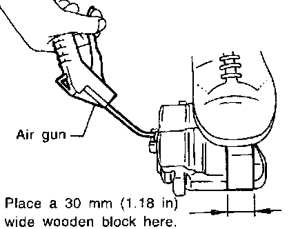 3) Place a wooden block as shown in the figure to prevent damage to the piston. Gradually supply compressed air via inlet of the brake hose to force piston out.