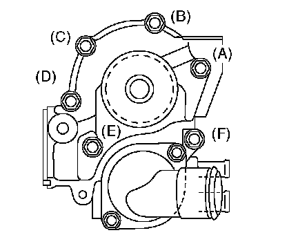 ^ When installing the water pump, tighten bolts in two stages in alphabetical sequence as shown in the figure.