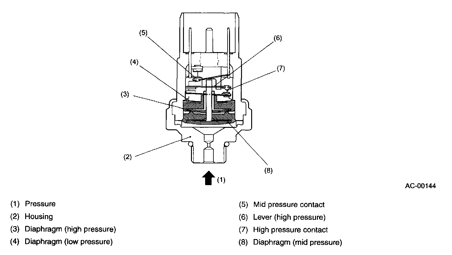 The pressure switch is a high-pressure side component of the refrigeration cycle (cooling cycle). It consists of a diaphragm that receives refrigerant gas pressure, a snap plate, a rod, and contacts that open both when the gas pressure is too low and when it is too high.