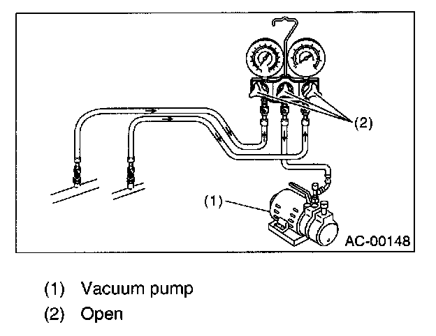 Before charging the refrigerant, evacuate the system using vacuum pump to remove air and moisture in the system. Moisture can be evaporated and removed easily even at normal temperature, if the system is evacuated using vacuum pump.