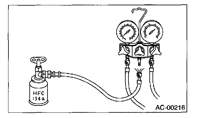 18. If the HFC-134a source is empty, close the low-pressure valve and then close the valve on can tap before replacing the empty source. Restart charging operation after replacing the HFC-134a source with a new one and purging.