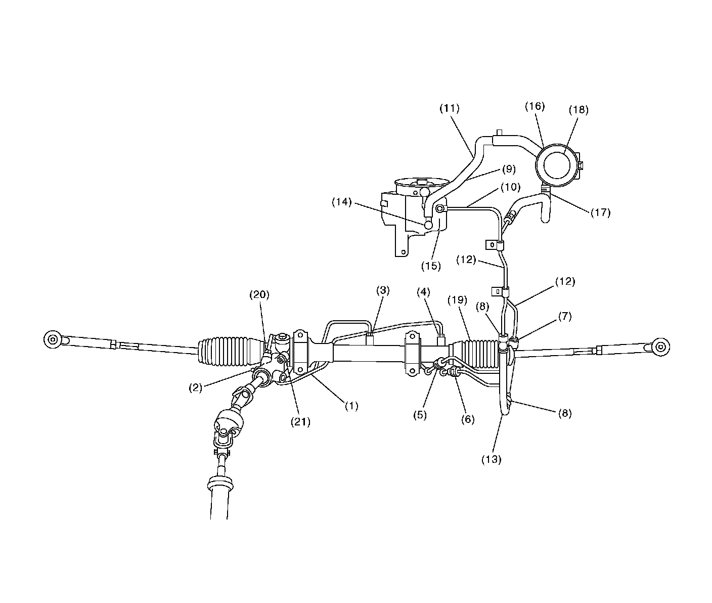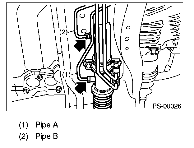 3. Remove the one pipe joint at the center of gearbox assembly, and then connect the vinyl hose to pipe and joint. Discharge fluid by turning steering wheel fully clockwise and counterclockwise. Discharge fluid similarly from the other pipe.
