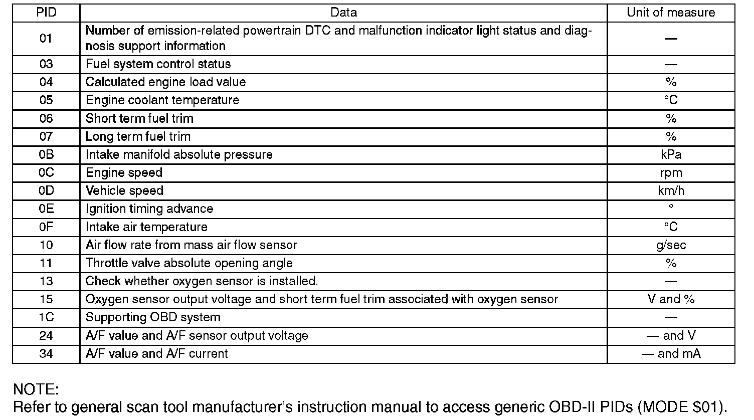 A list of the support data and PID (Parameter Identification) codes are shown in the table.