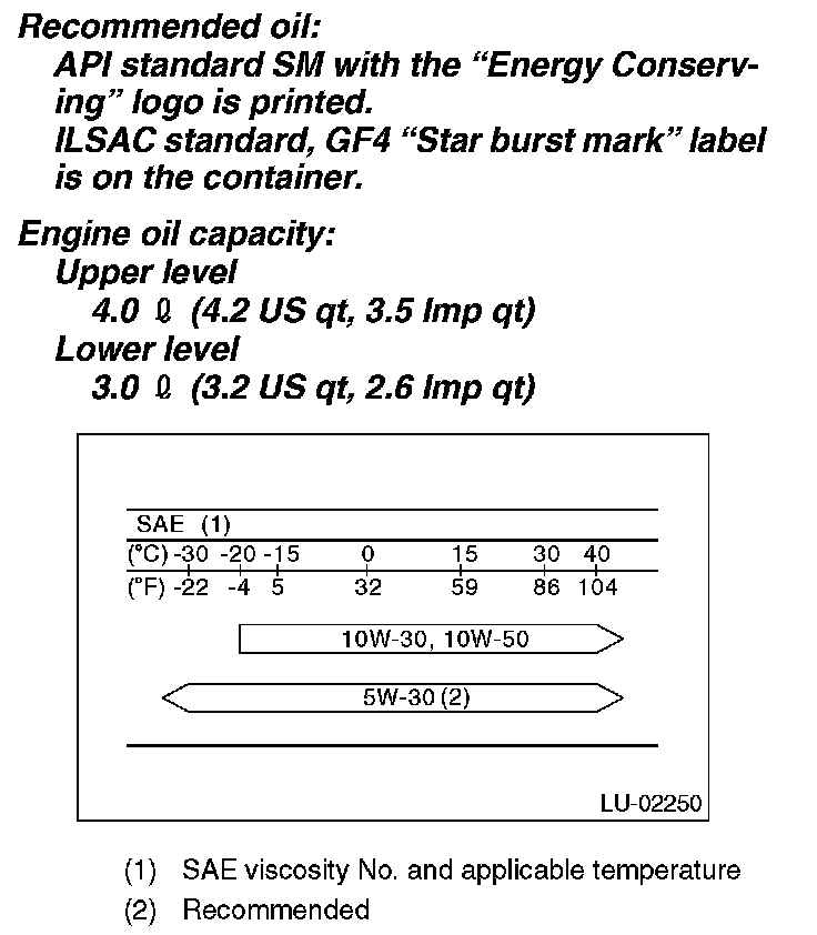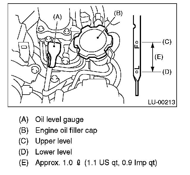 CAUTION: When replenishing oil, it does not matter if the oil to be added is a different brand from that in the engine; however, use oil having the API standard and SAE viscosity No. designated by SUBARU.