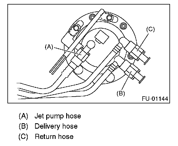 5. Disconnect the quick connector and then disconnect the fuel delivery hose, return hose and jet pump hose.