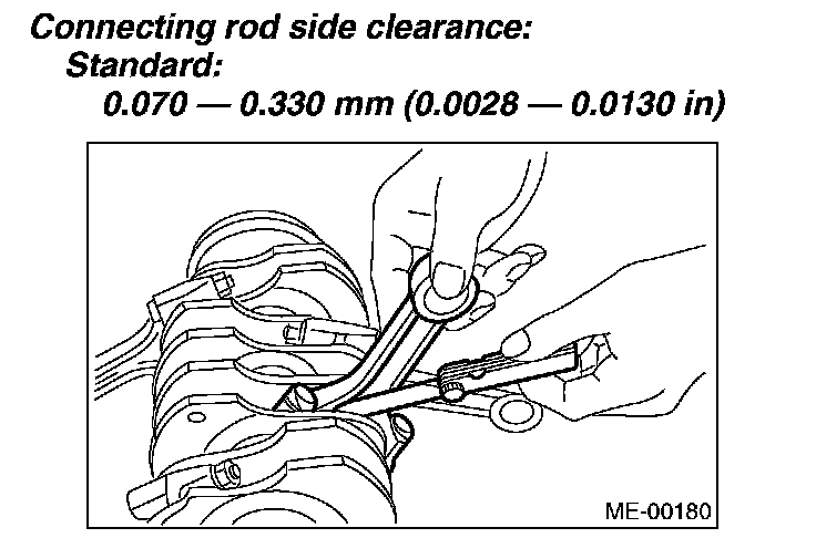3. Install the connecting rod fitted with bearing to crankshaft and measure the side clearance (thrust clearance). Replace the connecting rod if the side clearance exceeds the specified limit.