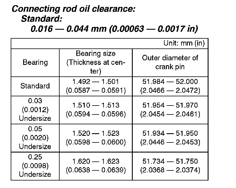 5. Measure the oil clearance on each connecting rod bearing using plastigauge. If any oil clearance is not within the standard, replace the defective bearing with a new part of standard size or undersize as necessary. (See the table below.)