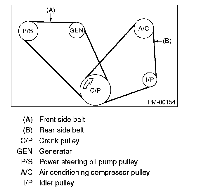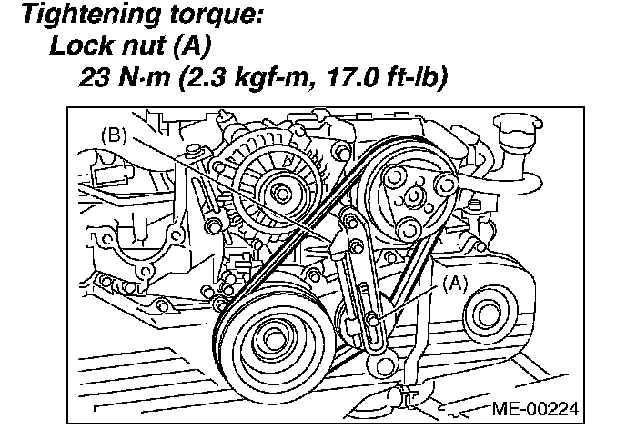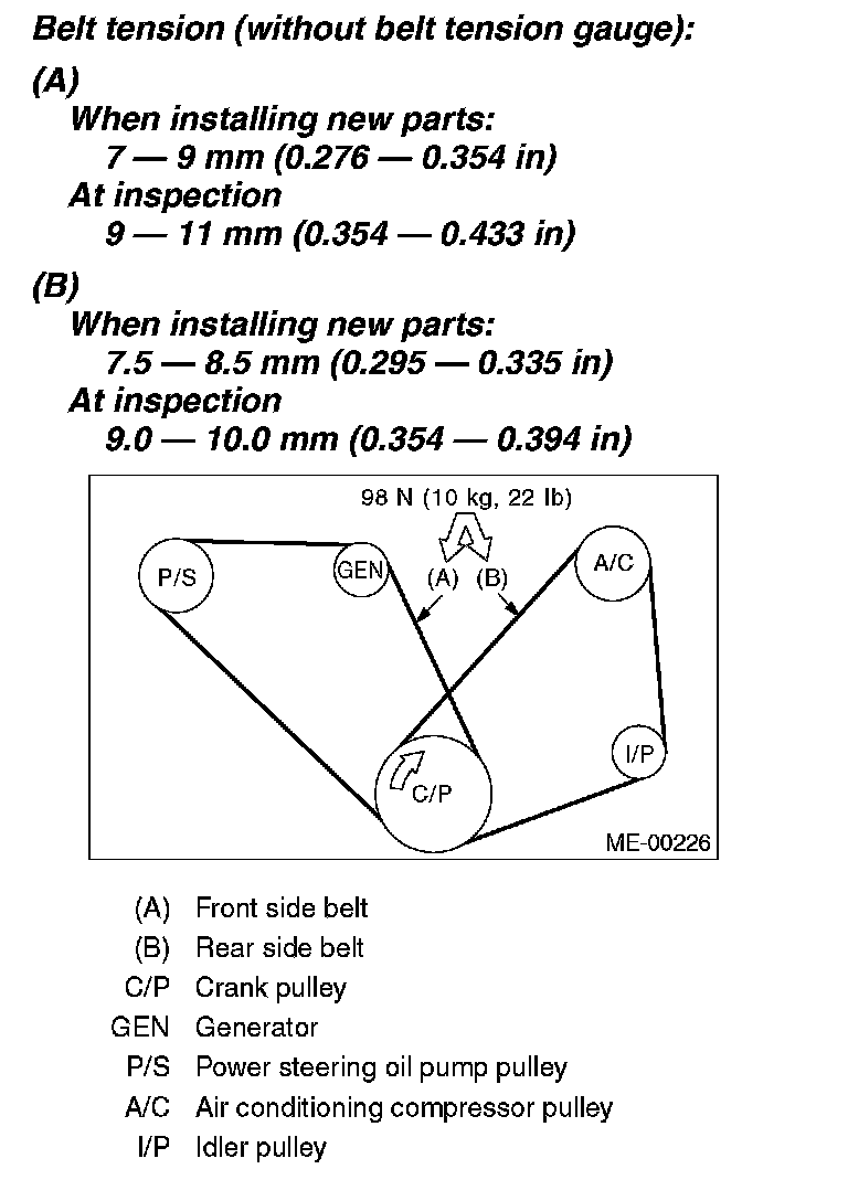 3. Check the V-belt tension and adjust it if necessary by changing the generator installing position or idler pulley installing position. Belt tension (with belt tension gauge):