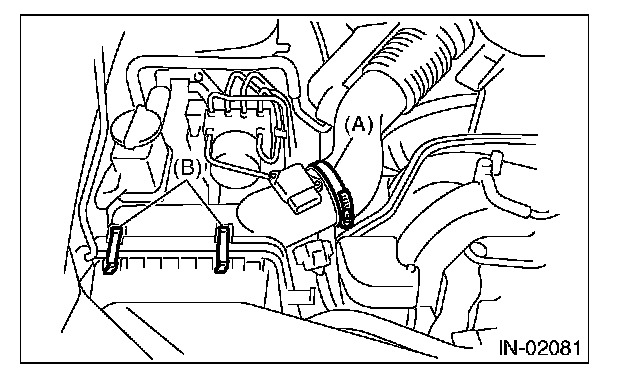 5. Remove the clip (B) securing the upper side of air cleaner case.