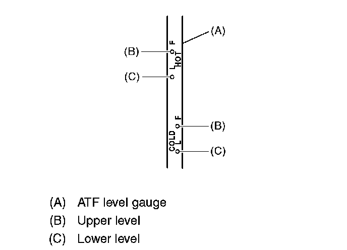 ^ Be sure that the replenishment of ATF to the upper level with the transmission cold will cause overfilling of ATF and result in a transmission failure.