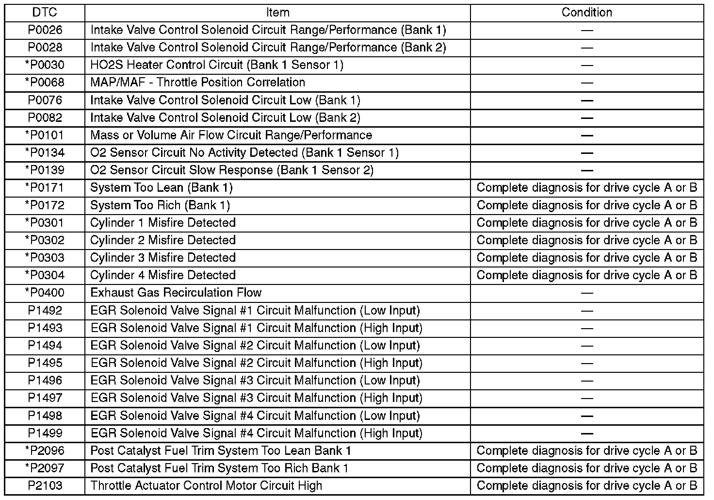 - Perform the diagnosis twice if the DTC marked with *. After completing the first diagnosis, stop the engine and perform second diagnosis in same condition.
