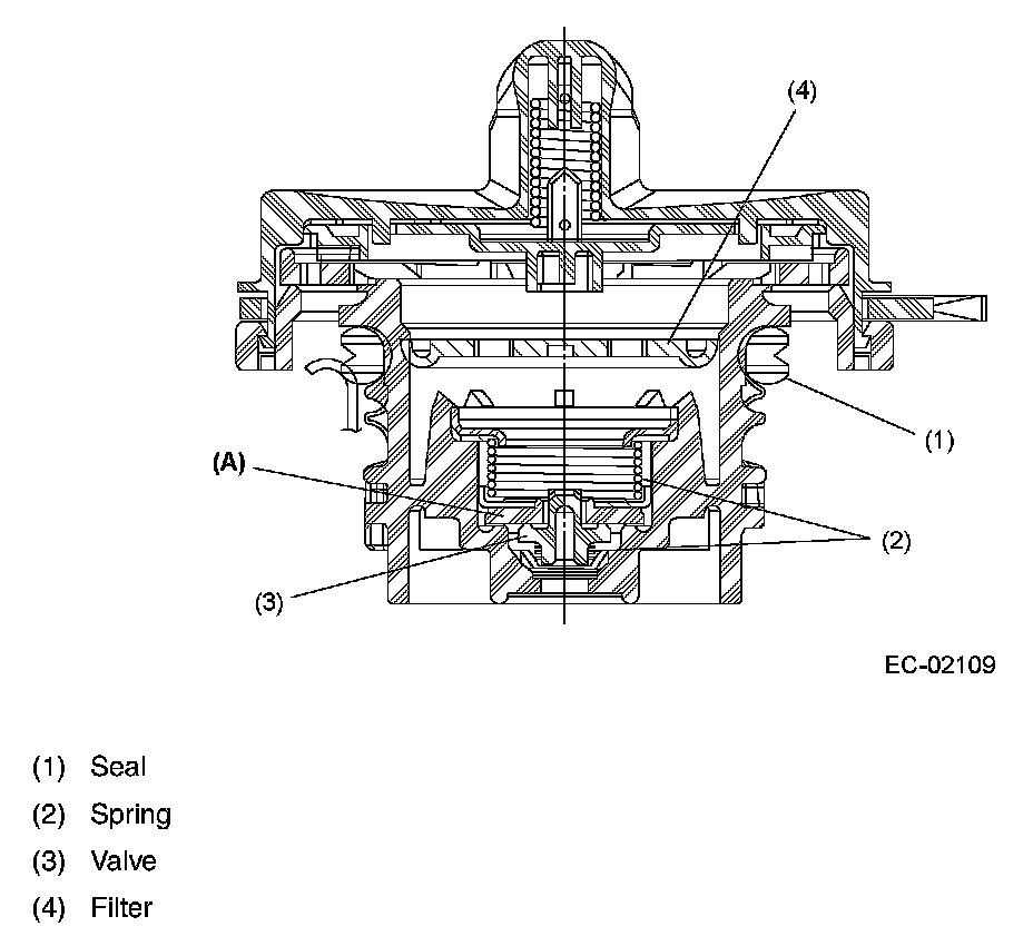 - The fuel tank cap has a relief valve, which prevents development of vacuum in the fuel tank in the event of a problem with the fuel vapor line. When there is no problem with the fuel vapor line, the filler pipe is sealed at the portion (A) and by the seal pressed against the filler pipe end. If vacuum develops in the fuel tank, the atmospheric pressure forces the spring down to open the valve; consequently outside air flows into the fuel tank, thus controlling the inside pressure.