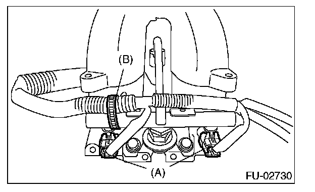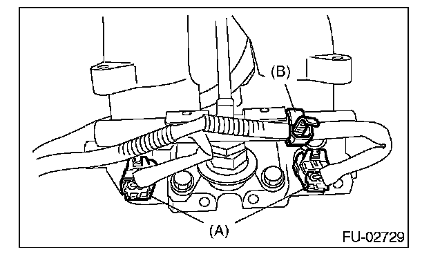 7. Remove the harness band (B) which holds the engine harness to injector pipe.