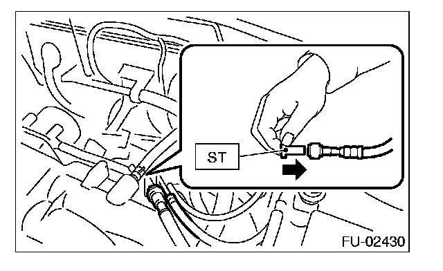 1. Disconnect the connector of fuel pipe by pushing the ST in the direction of arrow.