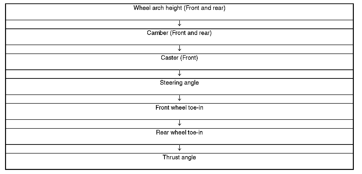 Check, adjust and/or measure the wheel alignment in accordance with procedures indicated in the figure: