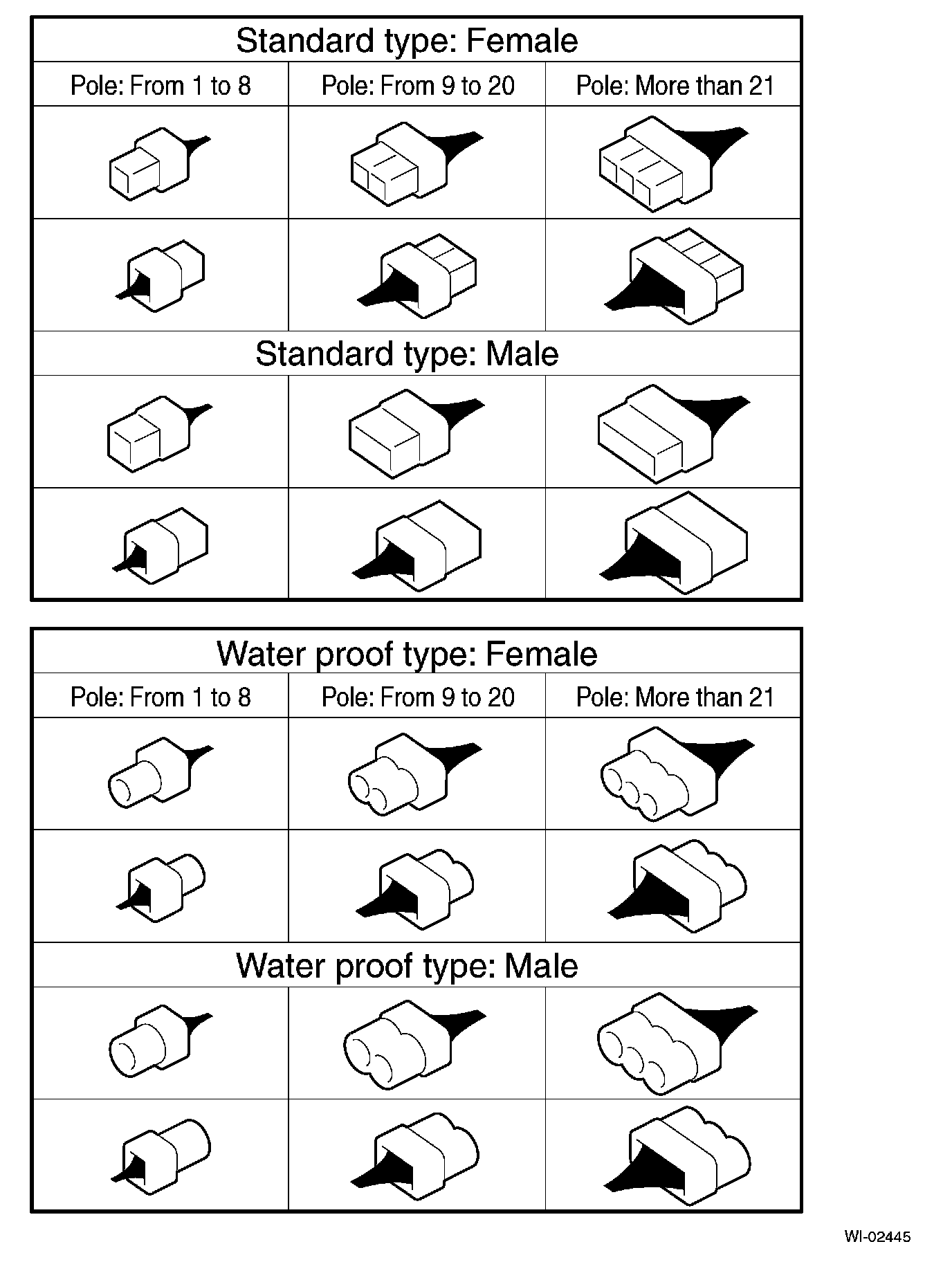 A number of connector symbols are used in each wiring diagram to easily identify the wiring harness connectors.