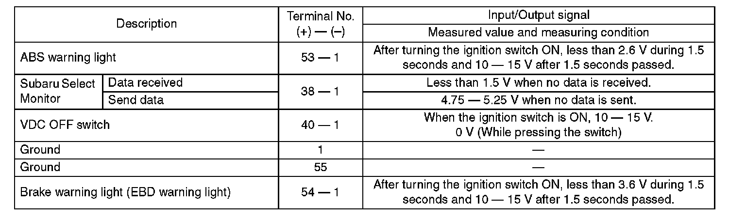 ^ When the connector is removed from VDCCM, the connector switch closes the circuit between terminals No. 53 and 54. Then, ABS warning light and brake warning light (EBD warning light) illuminates.