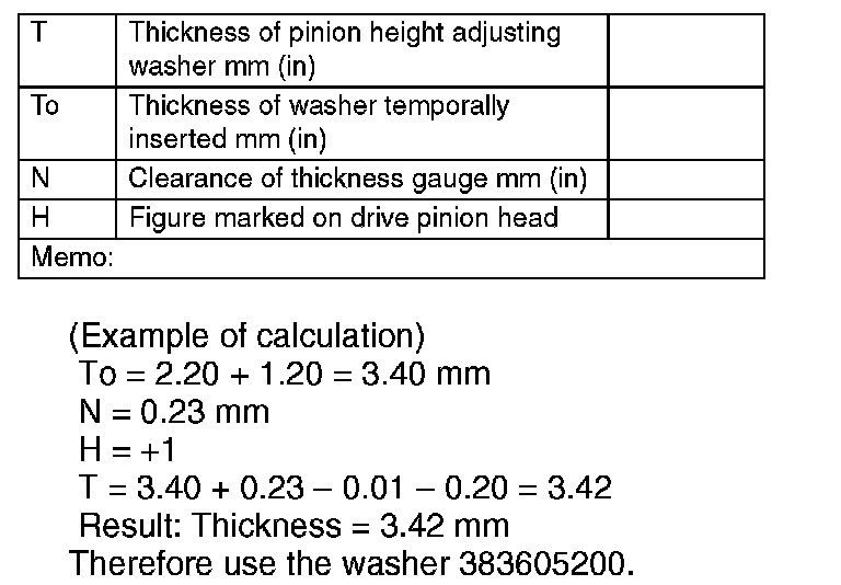 3. Obtain the thickness of pinion height adjusting washer to be inserted from the following formula, and replace the temporarily installed washer with this one.