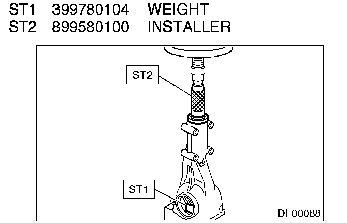 2. Install the rear bearing race (front) into differential carrier with ST1 and ST2.