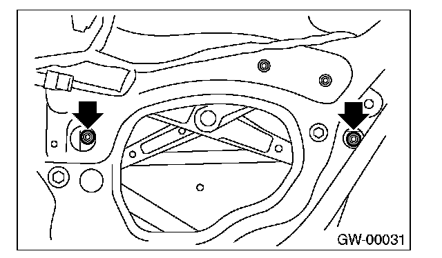 7. Operate the power window switch to move the glass to the position as shown in the figure, and remove two nuts.