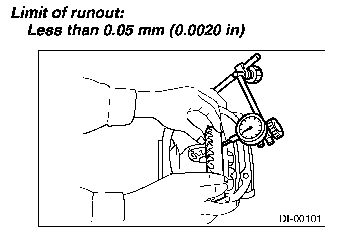 17) Check the hypoid driven gear runout on its back surface, and make sure that pinion and hypoid driven gear rotate smoothly.