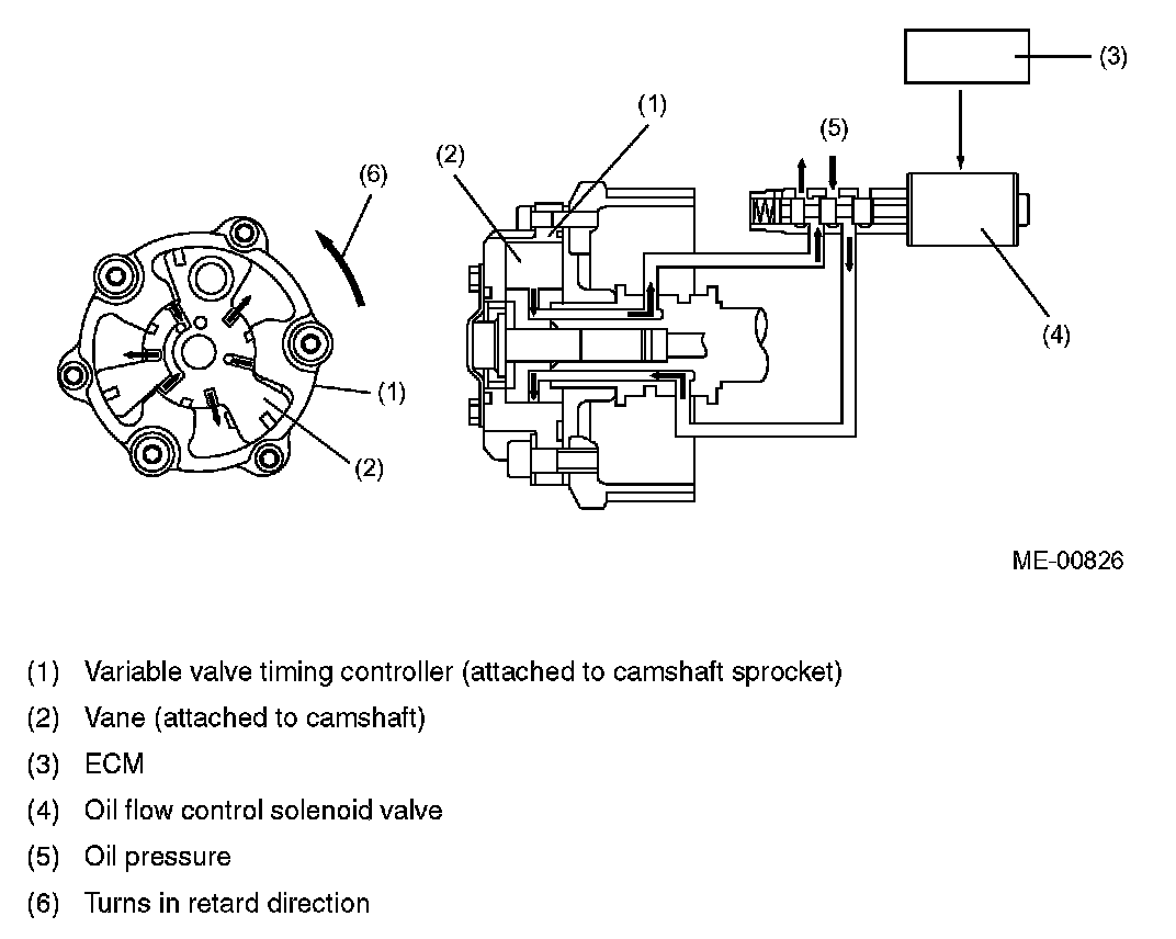 PHASE ANGLE RETARDSIn response to a retard signal from the ECM, the oil flow control solenoid valve moves its spool such that hydraulic pressure is applied to the retard chamber in the camshaft sprocket. The sprocket is then turned in the direction in which its phase angle retards relative to the camshaft.