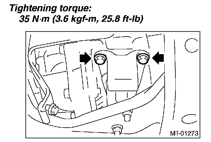 4) Move the transmission to the right side, then install the joint COMPL bolt, stay bolt and reverse check cable.