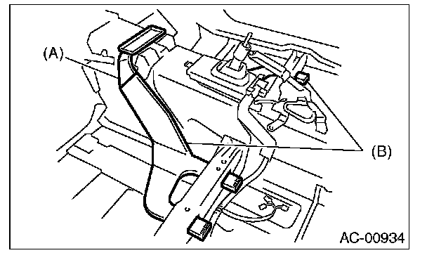 4. Pull off the floor mat to remove the rear center heater duct (A) and rear heater duct LH, RH (B).