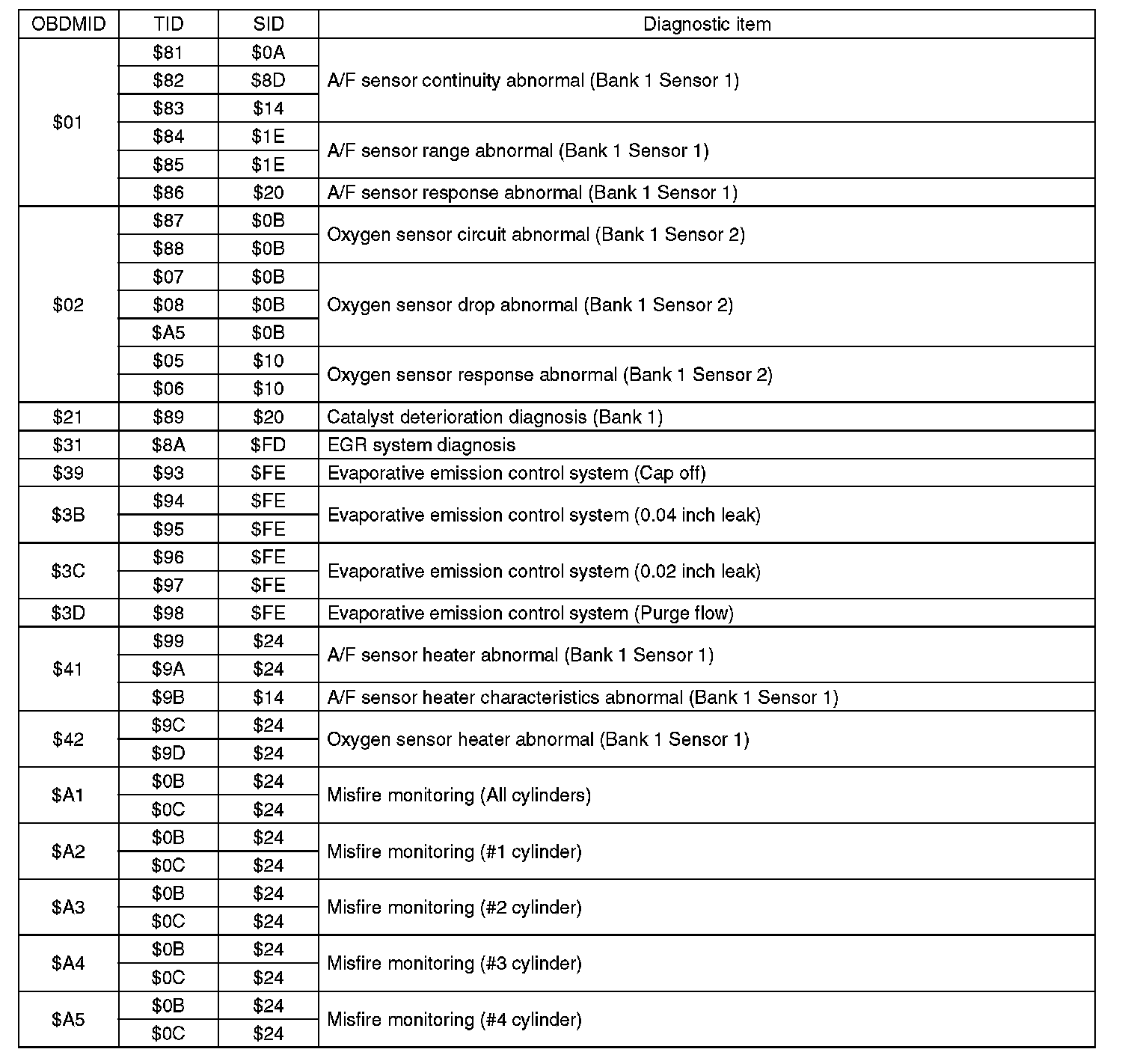 A list of the support data and PID (Parameter Identification) codes are shown in the table.