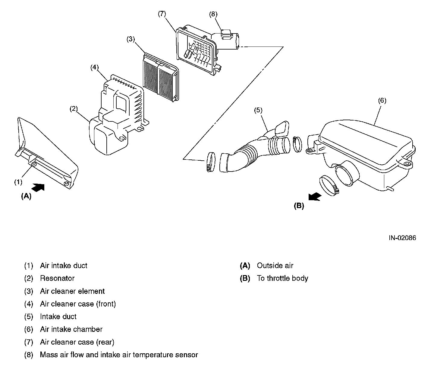 The intake system consists of an intake duct, a resonator chamber, and an air cleaner element housed in its case. The resonator chamber effectively reduces the intake noise level.