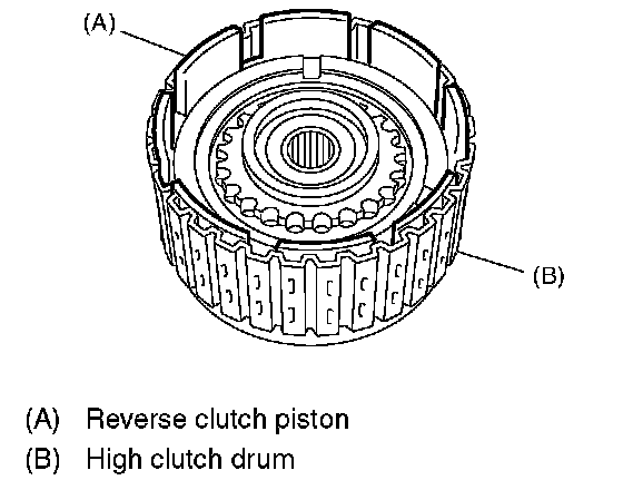 3. Install the reverse clutch piston to high clutch drum. Align the groove on reverse clutch piston with the groove on high clutch drum during installation.