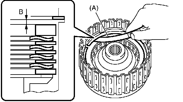 17. Measure and record the clearance B between the retaining plate and snap ring. (High clutch) At this time, do not press down the retaining plate.