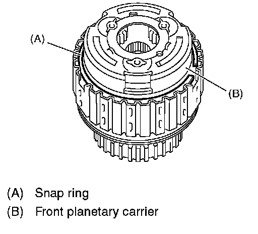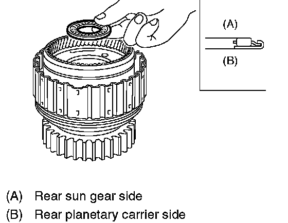 27. Measure and record the clearance B between the retaining plate and snap ring. (Reverse clutch) At this time, do not press down the retaining plate.