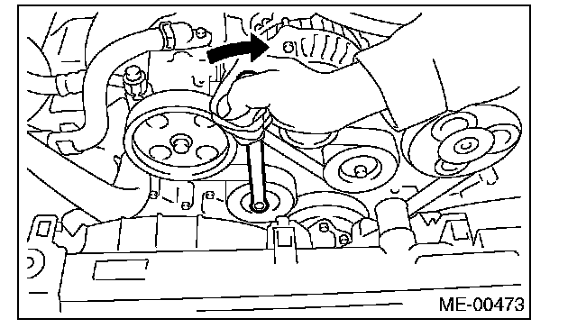2) Install the tool to belt tension adjuster assembly installation bolt.