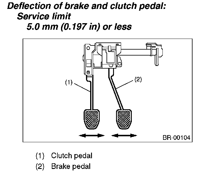 1. Move the brake and clutch pedal pads in the lateral direction with a force of approximately 10 Nm (1 kgf, 2 ft. lbs.) to ensure pedal deflection is in specified range.