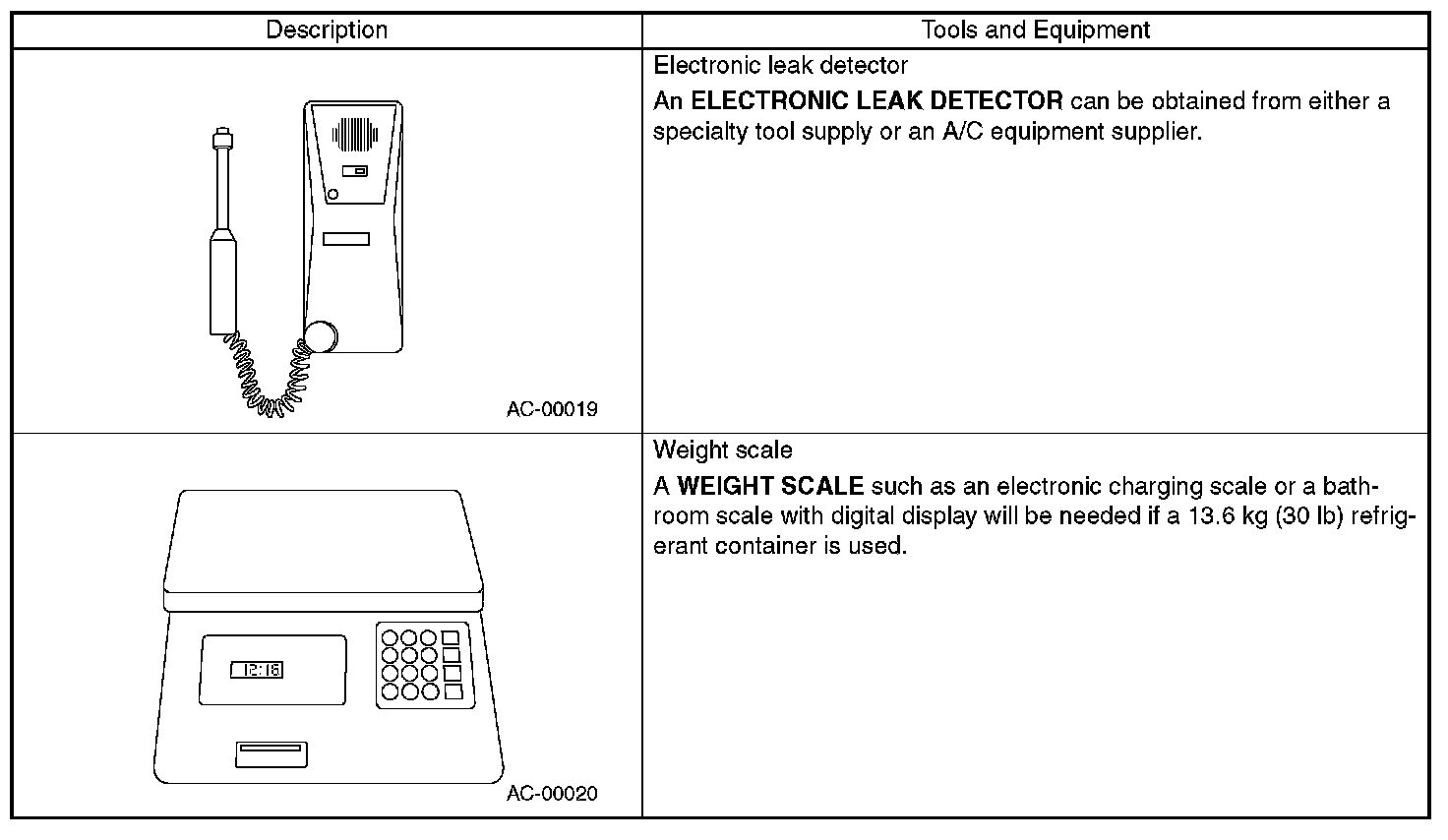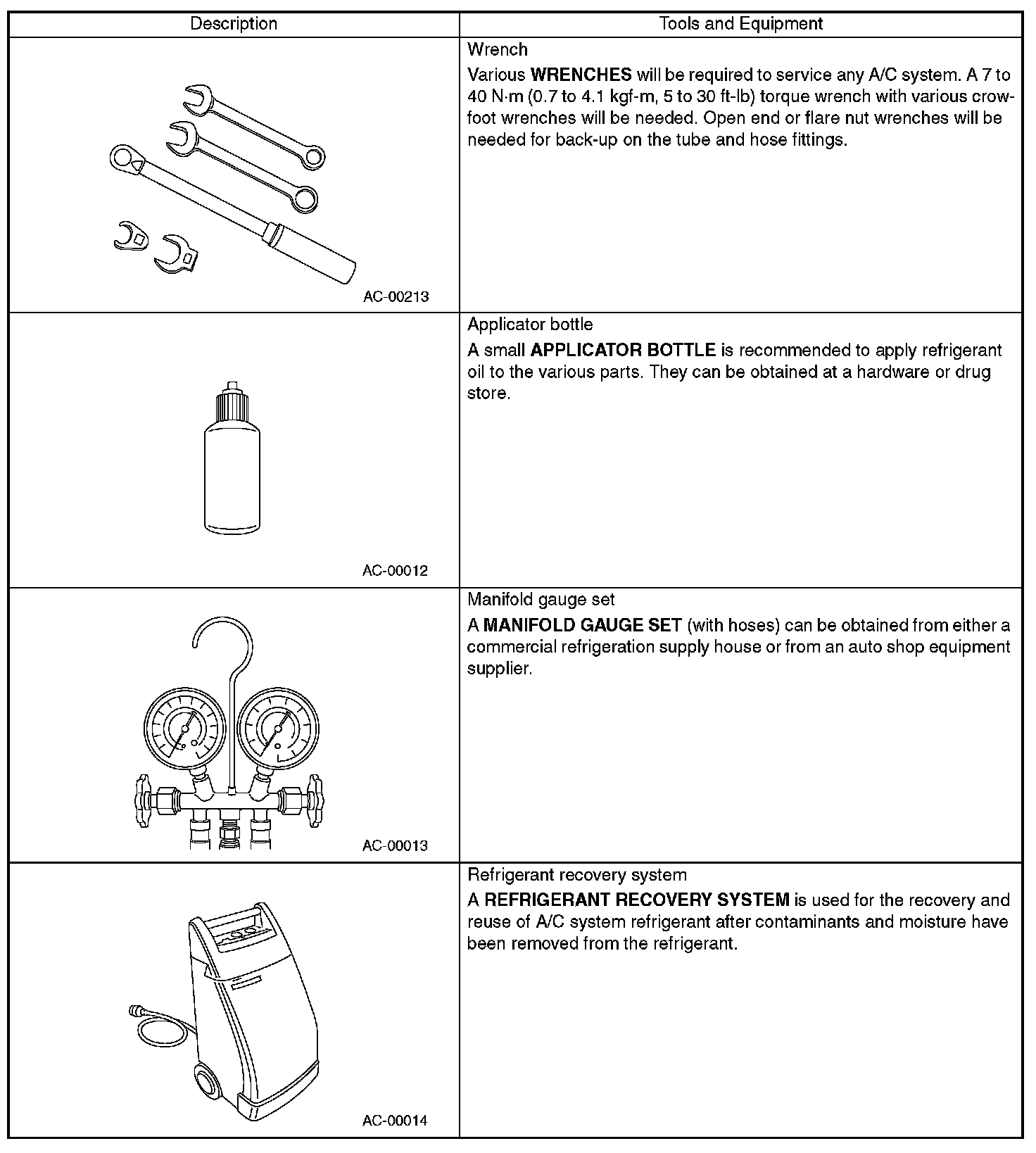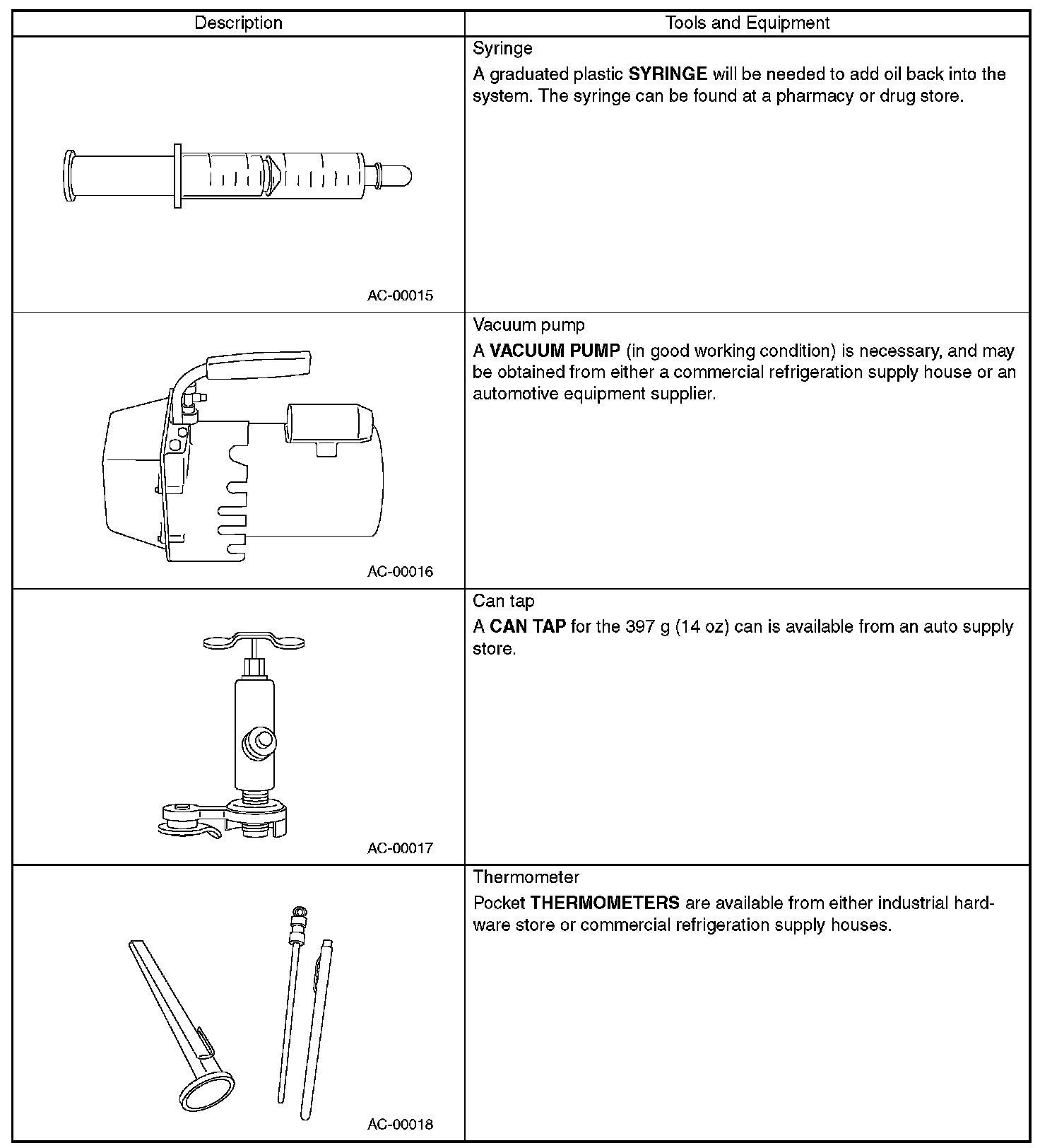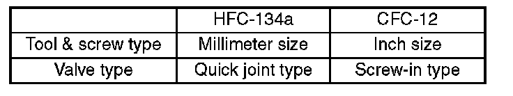 In order to help prevent mixing HFC-134a and CFC-12 parts and liquid, the tool and screw type and the type of service valves used are different. The gas leak detectors for the HFC-134a and CFC-12 systems must also not be interchanged.