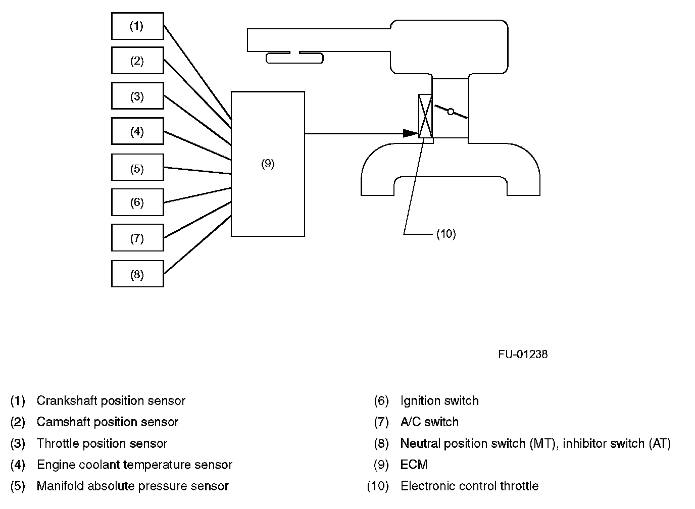 IDLE AIR CONTROL- The ECM controls the electronic control throttle based on signals from the crankshaft position sensor, engine coolant temperature sensor, manifold absolute pressure sensor and A/C switch so that the proper idle speed for each engine load is achieved.