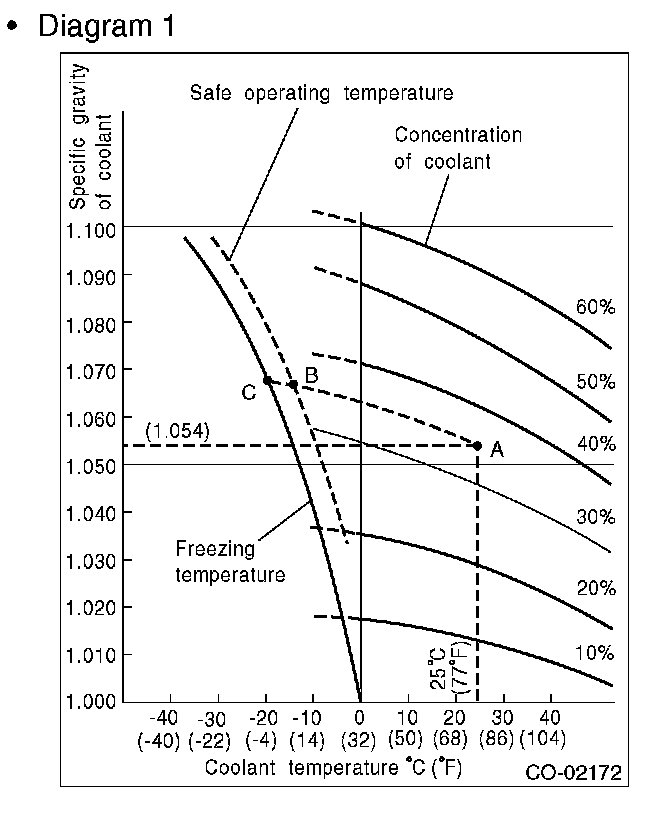If the coolant temperature is 25°C (77°F) and its specific gravity is 1.054, the concentration is 35% (point A), the safe operating temperature is -14°C (7°F) (point B), and the freezing temperature is -20°C (-4°F) (point C).