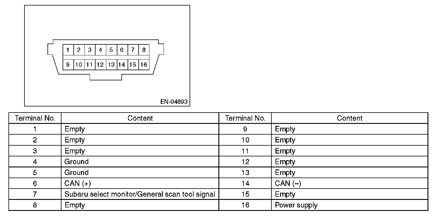 Data Link ConnectorNOTE: This connector is used for the general scan tool and the Subaru Select Monitor.