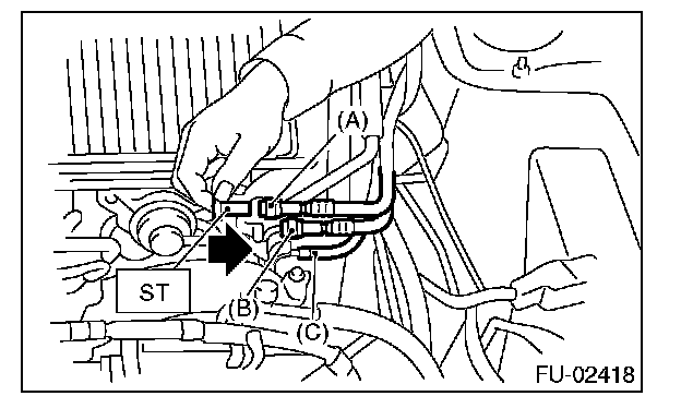 1. Disconnect the quick connector on the fuel delivery line and return line by pushing the ST in the direction of the arrow.