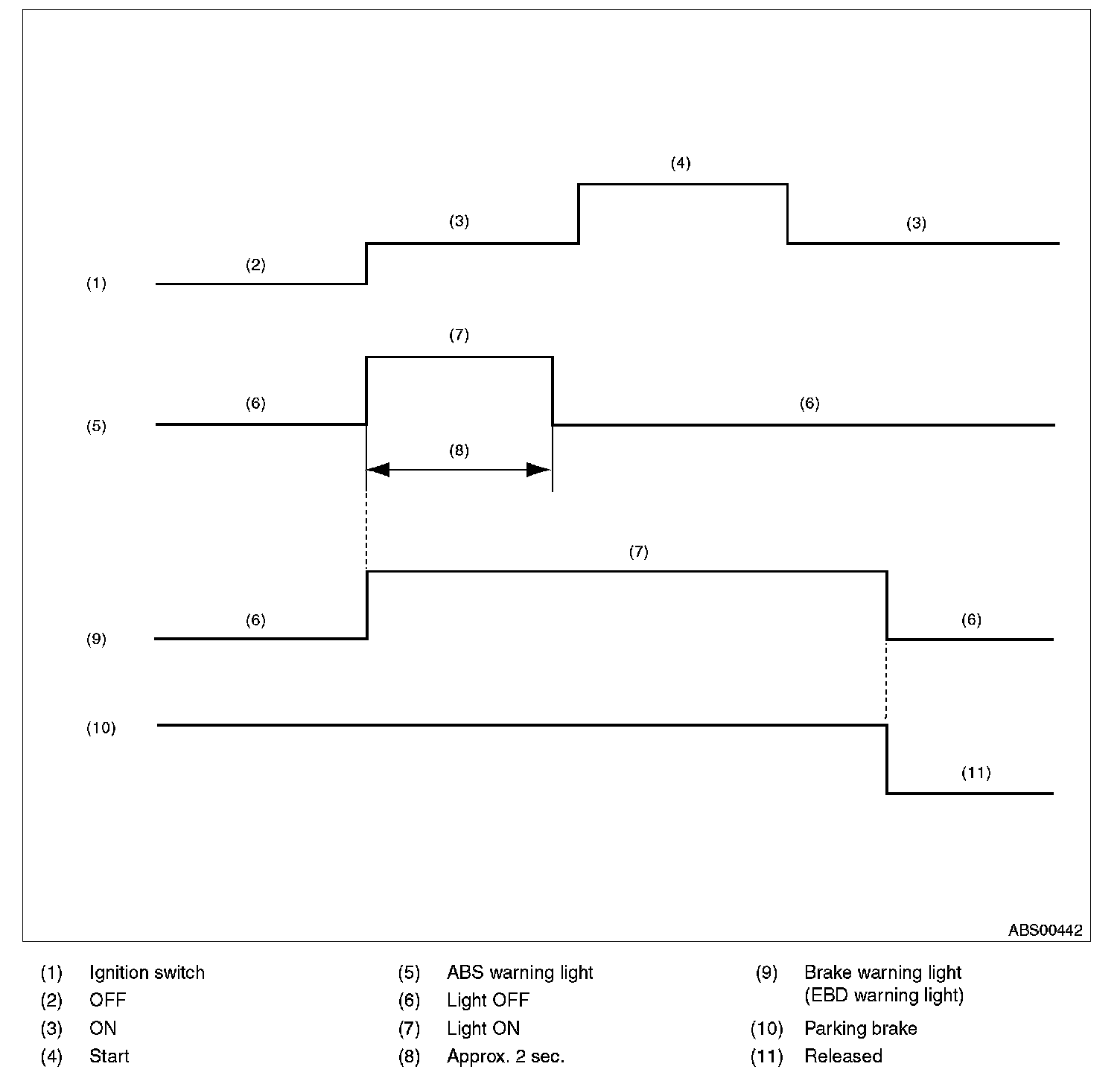 1) When the ABS warning light and brake warning light do not illuminate in accordance with this illumination pattern, it can be thought that there is an electrical problem.