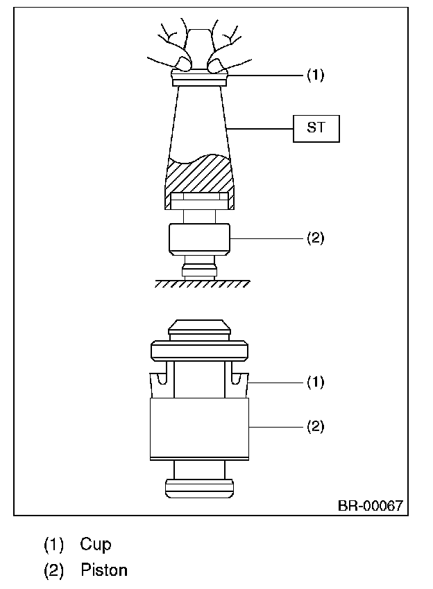 1) When attaching the cup, use the ST and apply brake fluid to the sliding surfaces to make installation smoother. Be careful of the direction of the cup at this time.