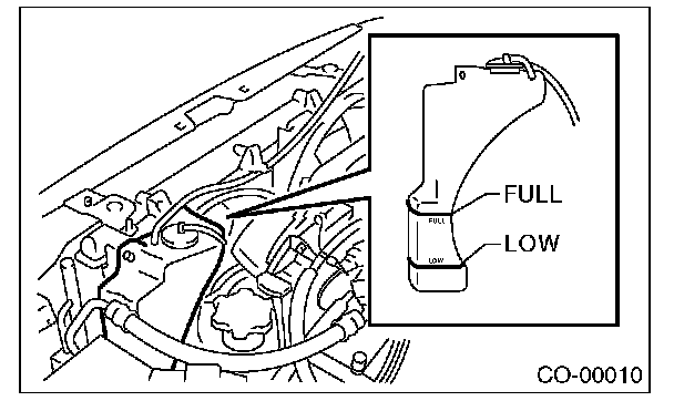 3) Fill engine coolant into the reservoir tank up to "FULL" level.
