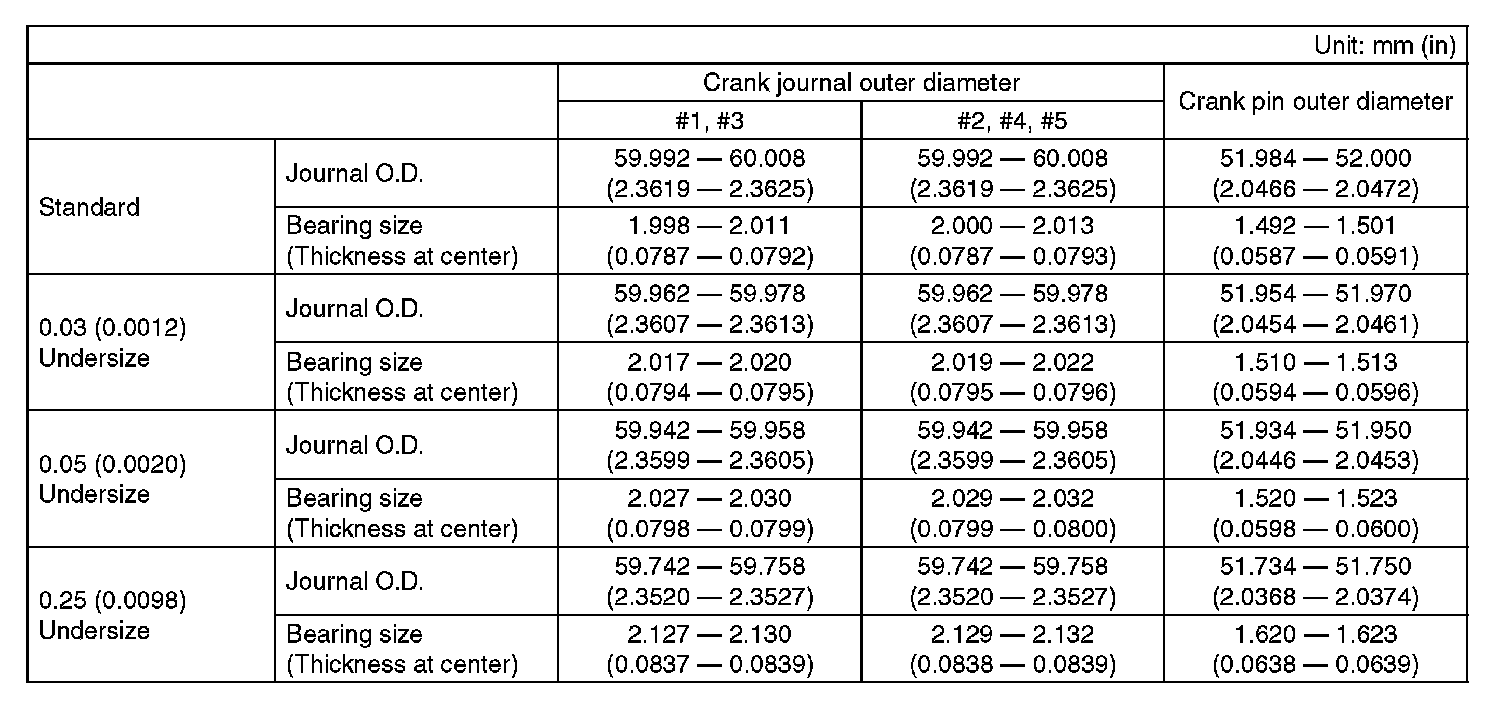 3) Inspect the crank journal and crank pin for wear. If they are not within the specification, replace the bearing with a suitable (undersize) one, and replace or grind to correct the crankshaft as necessary. When grinding the crank journal or crank pin, finish them to the specified dimensions according to the undersize bearing to be used.