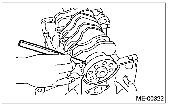 4) Use a thickness gauge to measure the thrust clearance of crankshaft at #5 crank journal bearing. If the clearance exceeds the limit, replace the bearing.