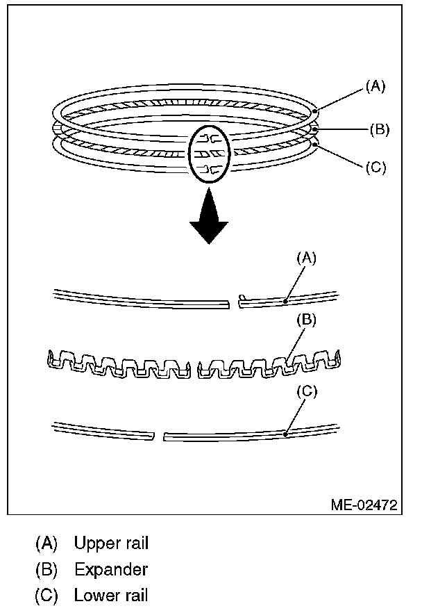 ^ Oil ring consists of the upper rail, expander and lower rail. When installing the oil ring on piston, be careful of each rails direction.