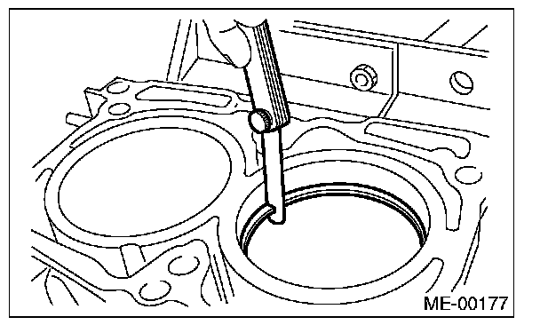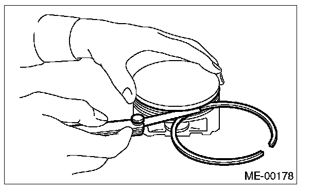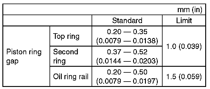 2) Squarely place the piston ring and oil ring in cylinder using the piston, and measure the piston ring gap with a thickness gauge.