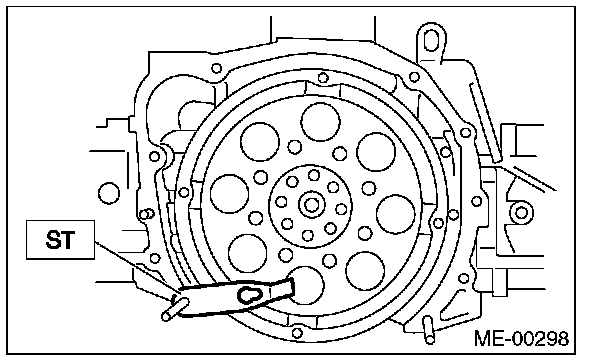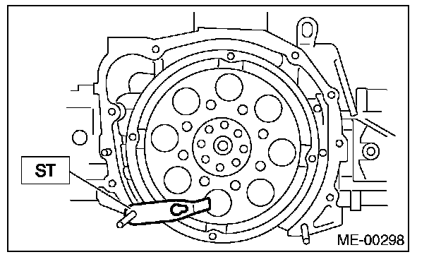 12) Remove the drive plate. (AT model) Using the ST, lock the crankshaft.